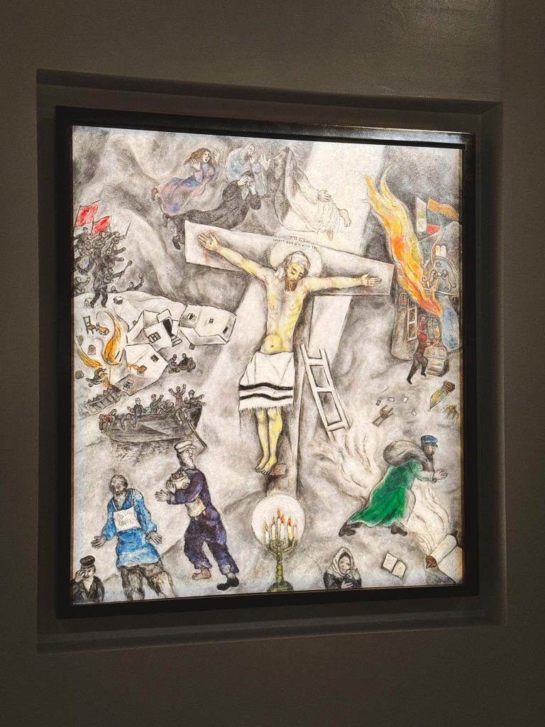La scelta di inaugurare il Museo del Corso con la Crocifissione Bianca è di per sé significativa. Proveniente dall’Art Institute di Chicago, questa tela è considerata una delle opere più importanti del Novecento. Chagall, con la sua sensibilità poetica e spirituale, riesce a intrecciare temi universali come la sofferenza, la fede e la speranza. La figura centrale di Cristo crocifisso, reinterpretata come simbolo del martire ebreo, diventa un ponte tra due tradizioni religiose, invita a una riflessione teologica profonda e onnicomprensiva.