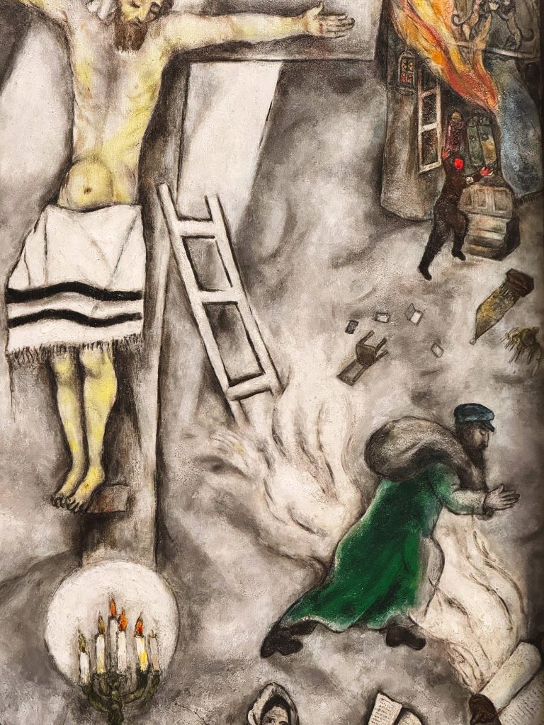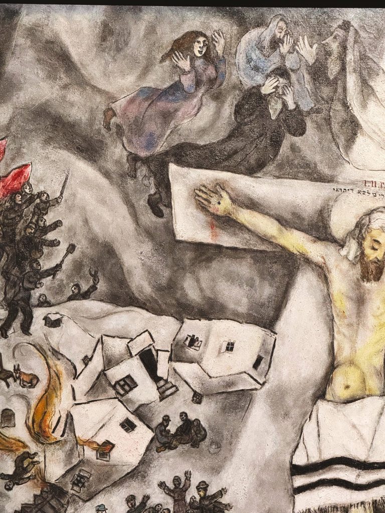 La Crocifissione Bianca nasce subito dopo uno degli episodi più atroci della storia recente: la Kristallnacht – la Notte dei Cristalli – tra il 9 e il 10 novembre 1938. Le strade di Germania, Austria e della regione dei Sudeti si riempirono di vetri infranti, case devastate, negozi saccheggiati, sinagoghe profanate. Nell’opera, Chagall dipinge una sinagoga in fiamme, la Torah violata, frammenti di preghiere e simboli sacri devastati. Ogni dettaglio evoca non solo la distruzione di un popolo, ma quella dell’intera umanità.