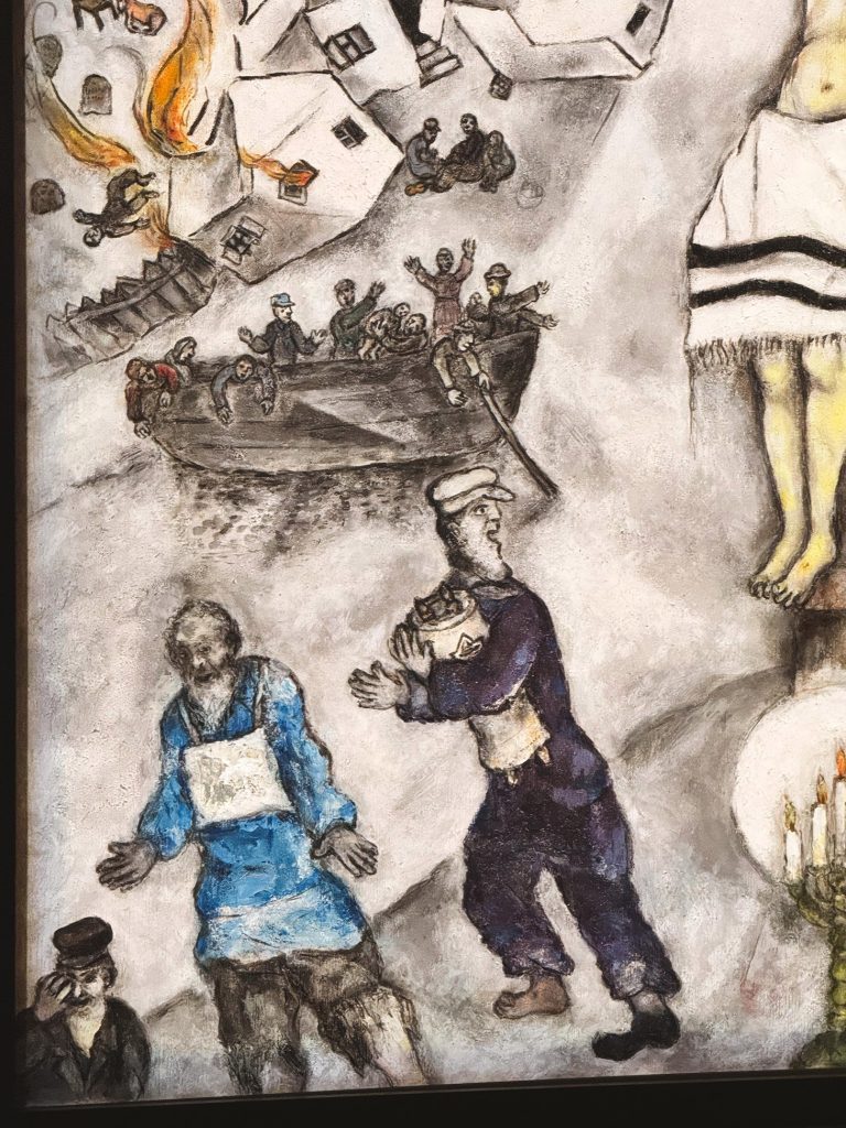 Nel dipinto i decenni di distruzione violenta contro gli ebrei – dalla Russia zarista alla Germania nazista – riecheggiano. In alto, contadini con bandiere rosse e attrezzi agricoli sembrano difendere il villaggio, ma è troppo tardi: l’orrore si è già consumato.