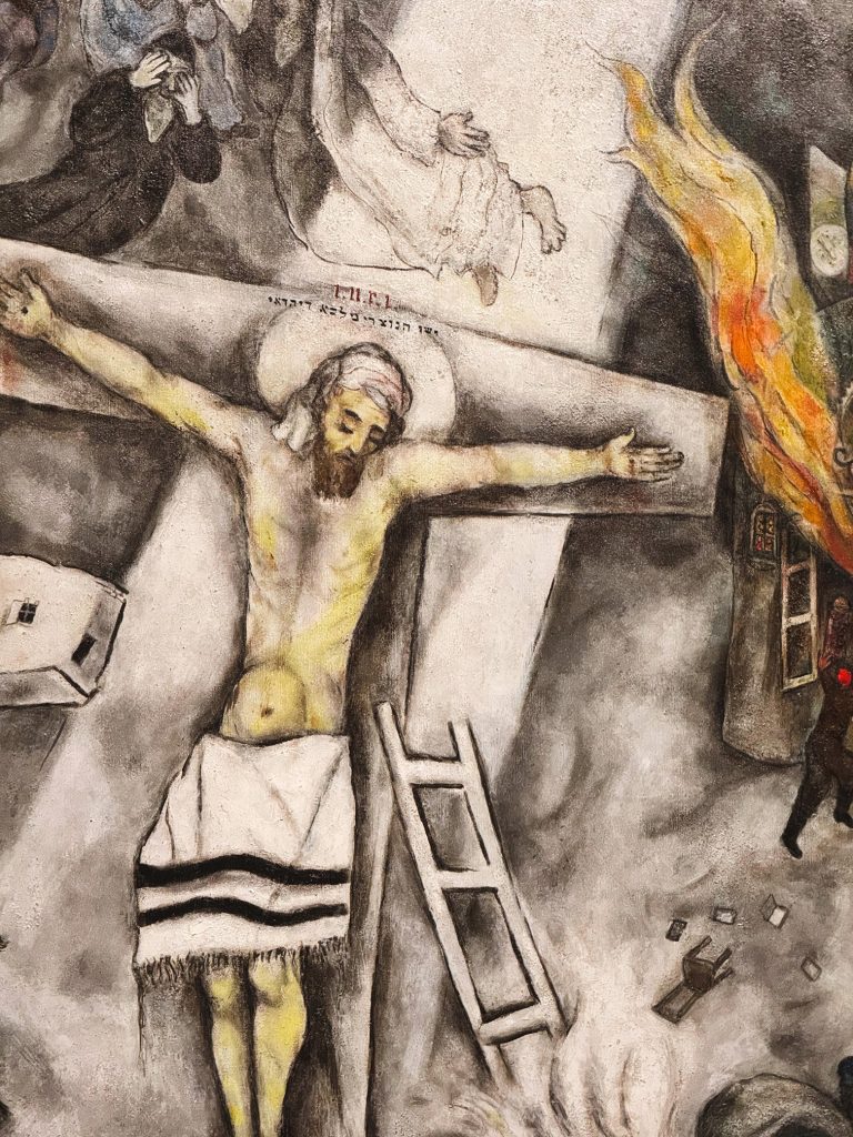 Nonostante la drammaticità delle scene di devastazione rappresentate nel quadro, Chagall infonde però un messaggio di speranza attraverso dettagli luminosi. La luce che scende dall’alto, ad esempio, rompe le tenebre e illumina il Crocifisso, suggerendo un’apertura verso la salvezza. La scala appoggiata alla croce richiama non solo la sofferenza, ma anche l’idea di redenzione, mentre il chiarore attorno al capo di Cristo si riflette nelle candele della menorah, unendo simbolicamente la luce della fede e della speranza.