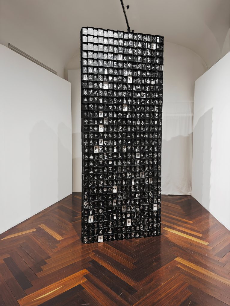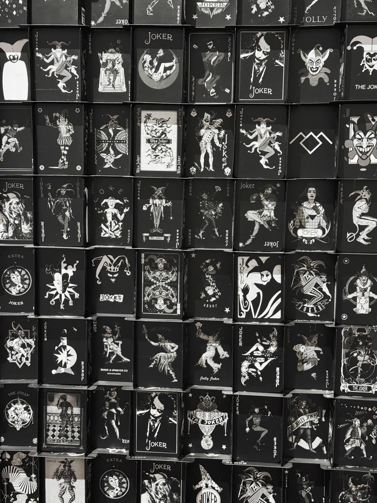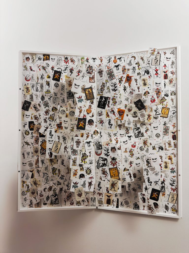 In Endsong, struttura totemica di tre metri composta da una fitta tessitura di carte nere, il Joker si declina in una molteplicità di varianti iconografiche che attraversano epoche diverse, dal Medioevo alla contemporaneità. L’opera si configura come un monolite instabile, un’architettura della crisi che convoca, per via allusiva, tanto l’immaginario cinematografico quanto quello archetipico. Vi si riconosce una chiara risonanza dell’universo visivo di Stanley Kubrick – in particolare del monolite di 2001: Odissea nello spazio – insieme alle atmosfere perturbanti che attraversano il cinema di David Lynch.
