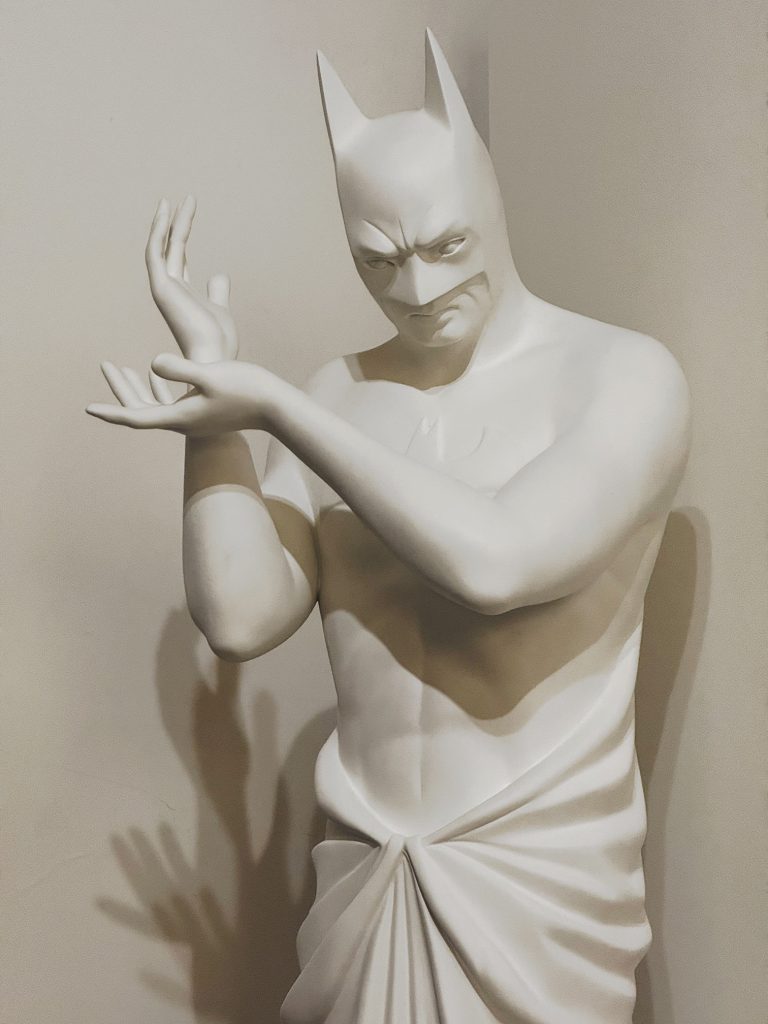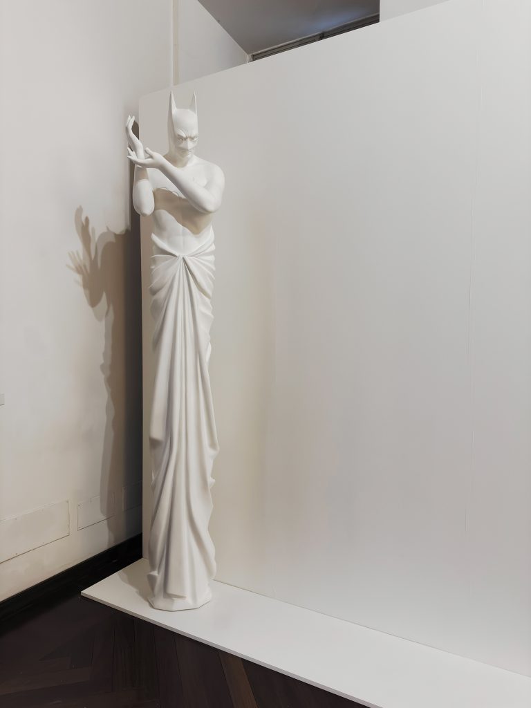 Il percorso assume così una scansione quasi teatrale: sulla destra, uno spazio in ombra dominato da Endsong; sulla sinistra, un corridoio che conduce a In Excelsis 6, scultura monumentale in cui una figura assimilabile a Batman è colta in una postura derivata dalla pratica yoga, con le mani nel gesto del coraggio; infine, uno spazio luminoso accoglie My Little White Book, chiudendo la sequenza con un’immagine destabilizzante e di forte intensità visiva.