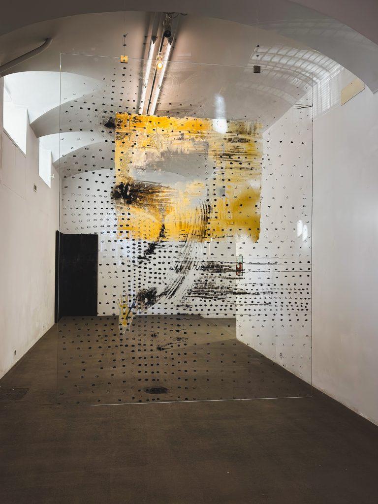 All’interno di questa cornice, Choreodrome si concentra sulla nozione di “quarta parete”, intesa come confine tra finzione e realtà. Tran ne esplora la permeabilità, immaginandola come una membrana attraversata da immagini, corpi e temporalità differenti. Le superfici in vetro trattate con grasso al litio radicalizzano questa indagine, mettendo in tensione trasparenza e opacità come condizioni simultanee. Il grasso diventa qui una metafora della mediazione contemporanea: un filtro che richiama la circolazione incessante di immagini di violenza – prive di risoluzione e di riscatto – e la loro sedimentazione nella percezione.