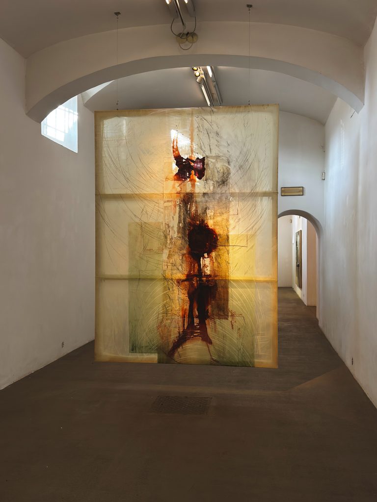 L’uso del lattice – derivato della gomma – introduce un ulteriore livello di complessità, evocando le storie di sfruttamento coloniale in Vietnam. La sua natura traslucida genera una visibilità incerta, un’apparizione instabile che colloca la superficie in una condizione sospesa tra emergenza e dissoluzione. La luce, attraversando questi strati, ne amplifica tanto la fragilità quanto la resistenza, costruendo un campo percettivo in cui consistenza e perdita convivono senza risolversi.