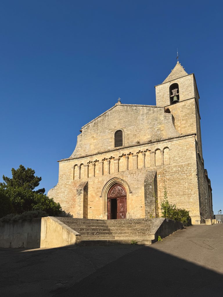 Nel Cinquecento fu aggiunto un portico con un portale a tre ante oggi tra gli elementi più sorprendenti; un grande arco gotico incornicia le arcate scolpite. A dominare l’edificio è il campanile piramidale che si innalza sopra la tripla navata, mentre il tetto in parte coperto di ardesia dona un tocco insolito rispetto alle tipiche coperture provenzali.