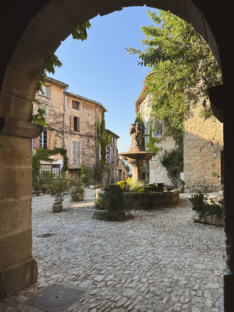 Intorno si innalzano case in pietra risalenti tra il XII e il XVIII secolo, con finestre color pastello e persiane di legno, avvolte da glicini ed edere rampicanti. Sono loro, insieme alla fontana, a rendere Place de la Fontaine uno dei luoghi più amati e fotografati del villaggio.