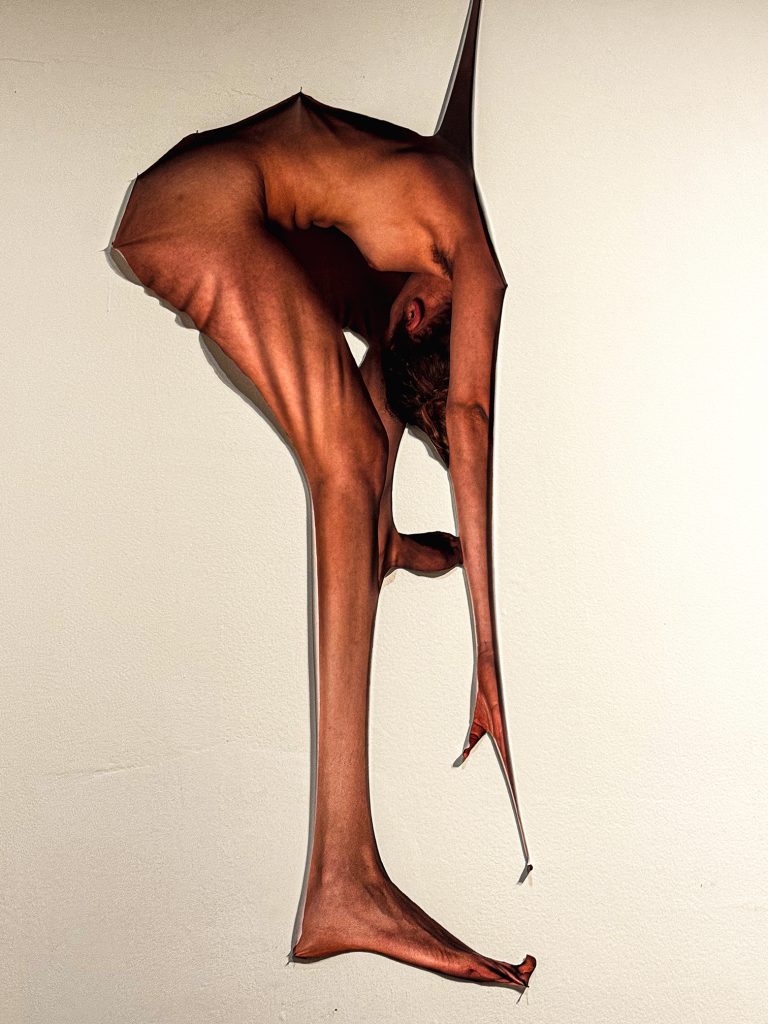 Qui si parte dall’idea che il corpo non sia una semplice presenza fisica, ma un linguaggio stratificato e continuamente riscritto. Il percorso si apre con il lavoro di Kensuke Koike e con la serie Today’s Curiosity, un archivio in continua evoluzione di immagini d’epoca, cartoline e fotografie, su cui l’artista interviene seguendo una regola ferrea: nothing added, nothing removed. Tagliando, piegando, ruotando e ricomponendo una singola immagine senza aggiungere né sottrarre materiale, Koike destabilizza l’identità visiva del soggetto e la nostra percezione. Il corpo appare e scompare, si frammenta, si moltiplica, perde riconoscibilità per diventare esperienza percettiva.