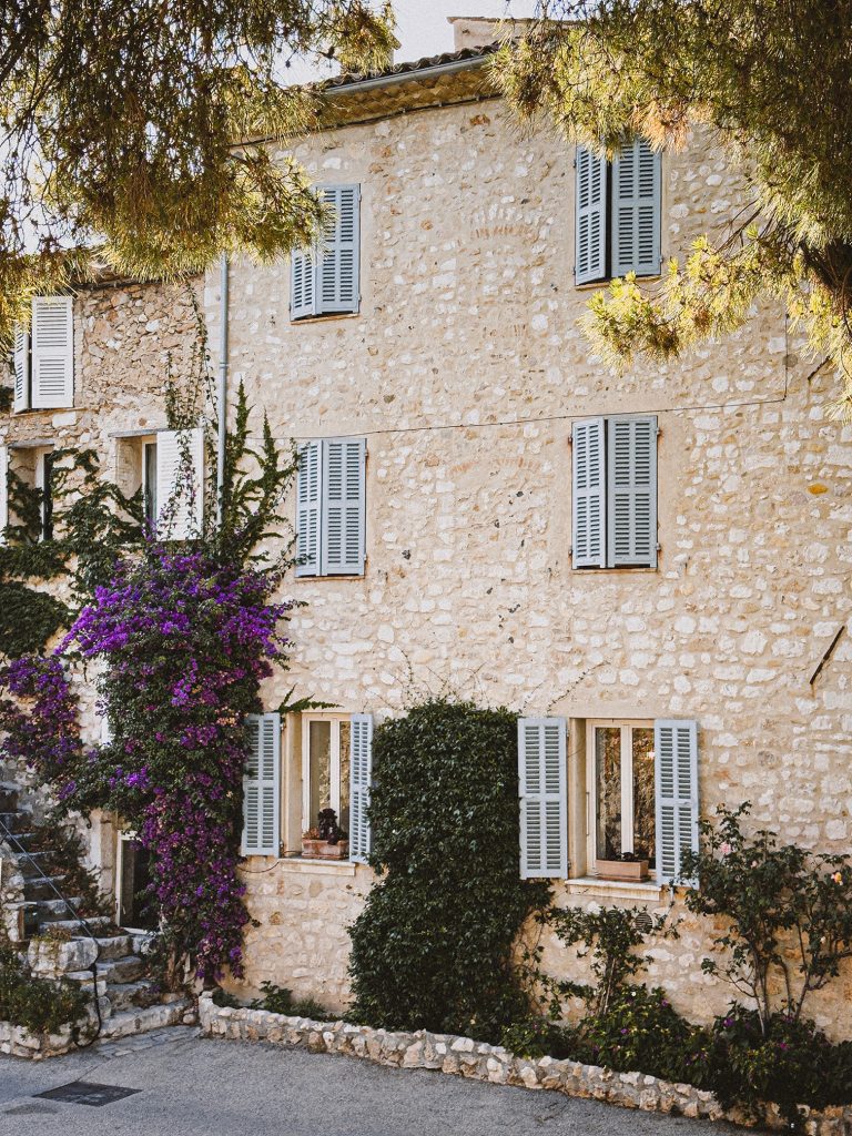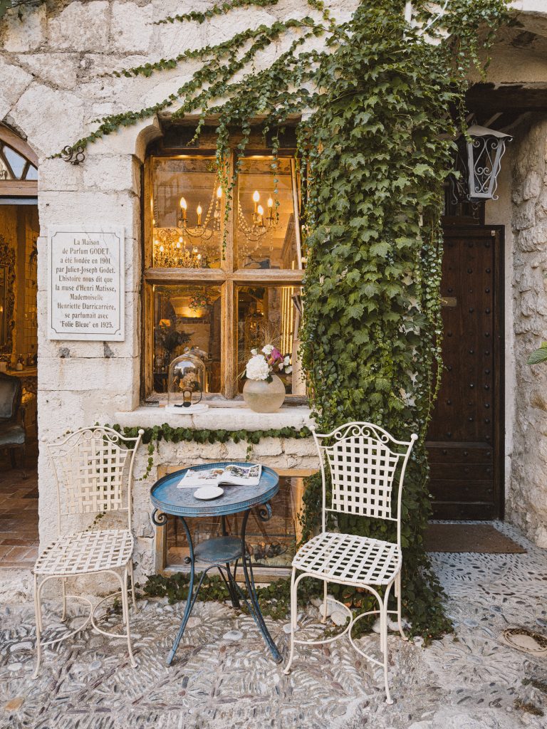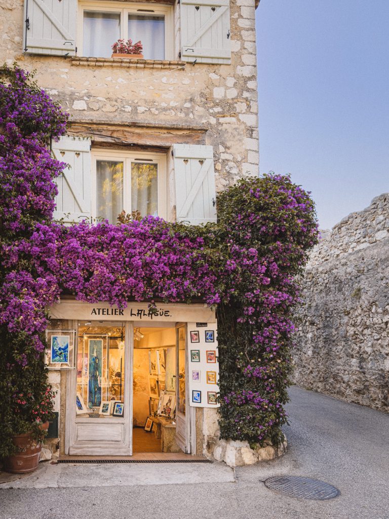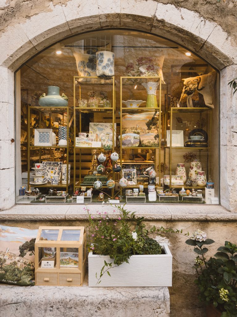 Subito oltre l’arco, inizia rue Grande, la strada principale che taglia il villaggio da un’estremità all’altra. È qui che si sviluppa il cuore vivo di Saint-Paul: un intreccio di botteghe d’arte, profumerie artigiane e gallerie che sembrano piccole cappelle votive dedicate alla bellezza. L’aria profuma di mirto, rosmarino e bergamotto. Le persiane sono scolorite dal sole e ricoperte di edera.