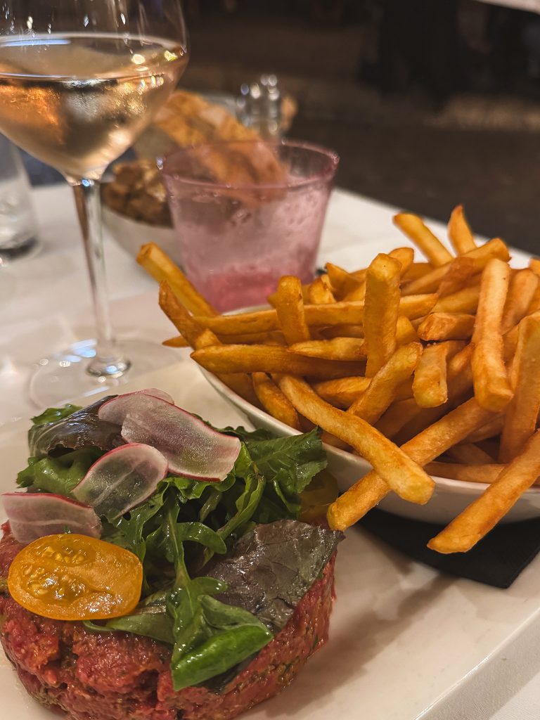 Anche i ristoranti a Saint-Paul-de-Vence hanno l’aspetto di un’opera d’arte. Le Tilleul (Pl. du Tilleul), ad esempio, sembra uscito da un dipinto impressionista: i tavolini affacciati sulla terrazza, le fronde larghe dei tigli che proteggono dal sole del pomeriggio, il silenzio che scivola piano tra le sedie. Potrebbe sembrare uno di quei ristoranti pensati per i turisti distratti, ma sorprende. I piatti sono preparati con ingredienti freschissimi del territorio: la tartare è profumata e gustosa, il filetto di manzo tenero e succulento; tutto accompagnato da erbe aromatiche e olio d’oliva dorato. Il servizio è gentile, discreto, senza fretta. Conviene lasciare il proprio nome al mattino e tornare più tardi, quando il borgo inizia a rallentare.