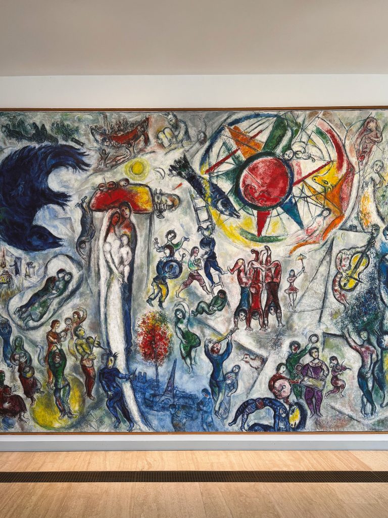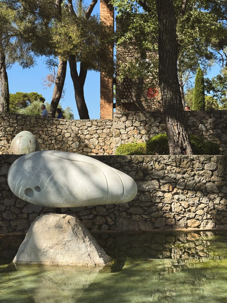 All’esterno si trova il Labirinto di Miró, dove venti sculture abitano un percorso onirico, come un rito iniziatico. Il cammino si conclude con l’Arco-Minotauro. Poco distante, la Corte Giacometti accoglie figure slanciate che sembrano camminare nella luce. La magia prosegue nel Giardino delle Sculture: la fontana animata di Pol Bury, la monumentalità aerea di Calder, la leggerezza intensa di Barbara Hepworth. Ogni artista ha lasciato una traccia, una firma poetica. Il mosaico di Braque, “Les Poissons”, nuota nel fondo di una vasca, mentre gli innamorati di Chagall sognano sospesi su un muro. E poi Tal Coat, Arp, Chillida, Takis.