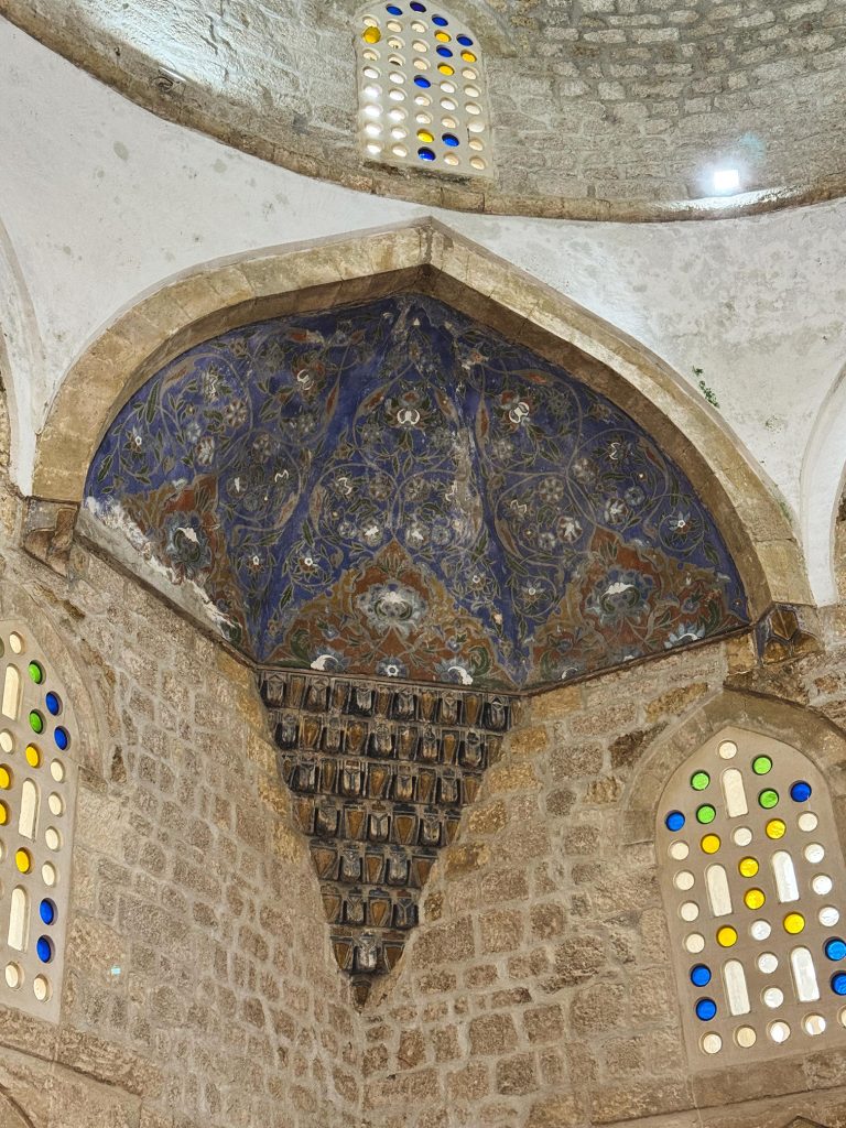 La sua architettura è una fusione poetica: ottomana nell’anima, mediterranea nei dettagli. I quattro archi sopra l’ingresso, ognuno diverso dall’altro, non sono solo decorazioni: sono variazioni sul tema del tempo. Ogni curva e angolo, racconta un momento, un secolo, un passaggio.