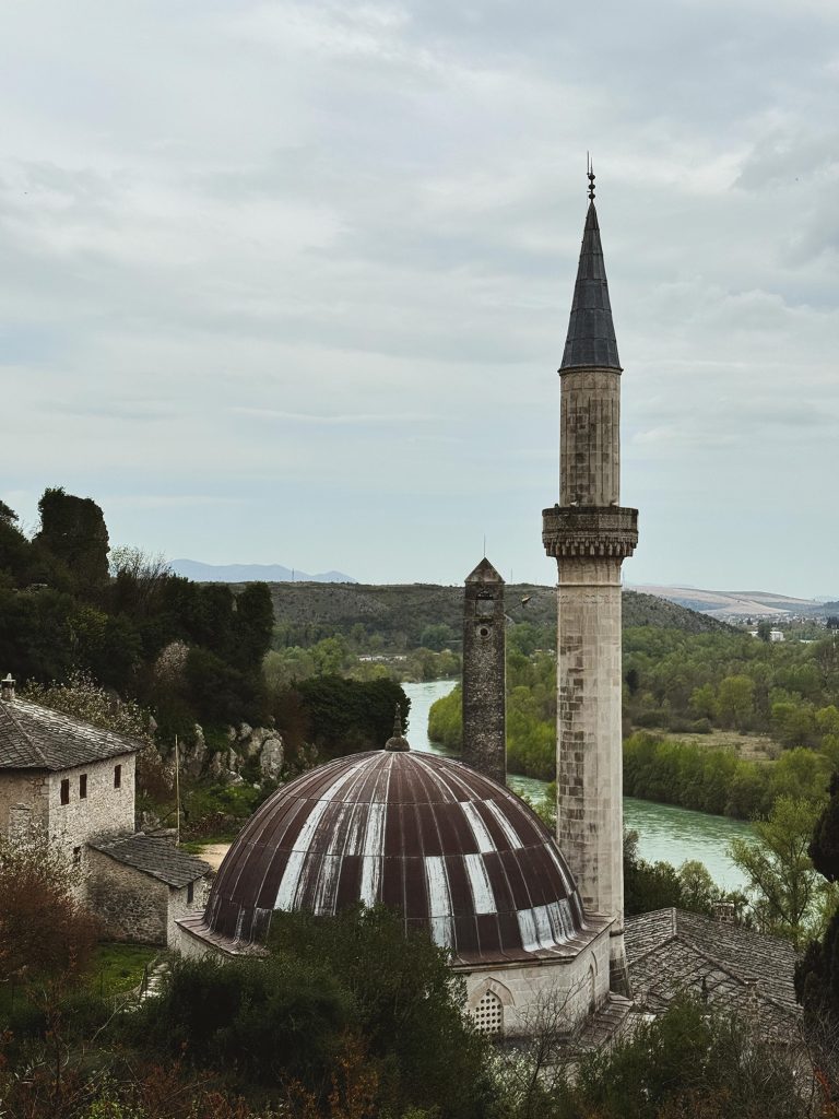 Dopo aver parcheggiato in uno dei piccoli parcheggi all’ingresso del villaggio, le stradine acciottolate salgono in silenzio, fiancheggiate da case in pietra e moschee dalle linee eleganti. Verso la sommità del villaggio, si raggiunge il cuore sacro di Počitelj: la moschea e la madrasa. Da qui, il sentiero si biforca. A sinistra, una breve e ripida salita conduce alla torre che si affaccia sulla Neretva: un punto panoramico affascinante, ma vertiginoso. A destra, la strada si snoda, portando a un nuovo belvedere: una moderna struttura in ferro e vetro, discreta ma scenografica, da cui lo sguardo abbraccia a 360 gradi la valle, il fiume, l’intero villaggio, che si aggrappa con fierezza al pendio.