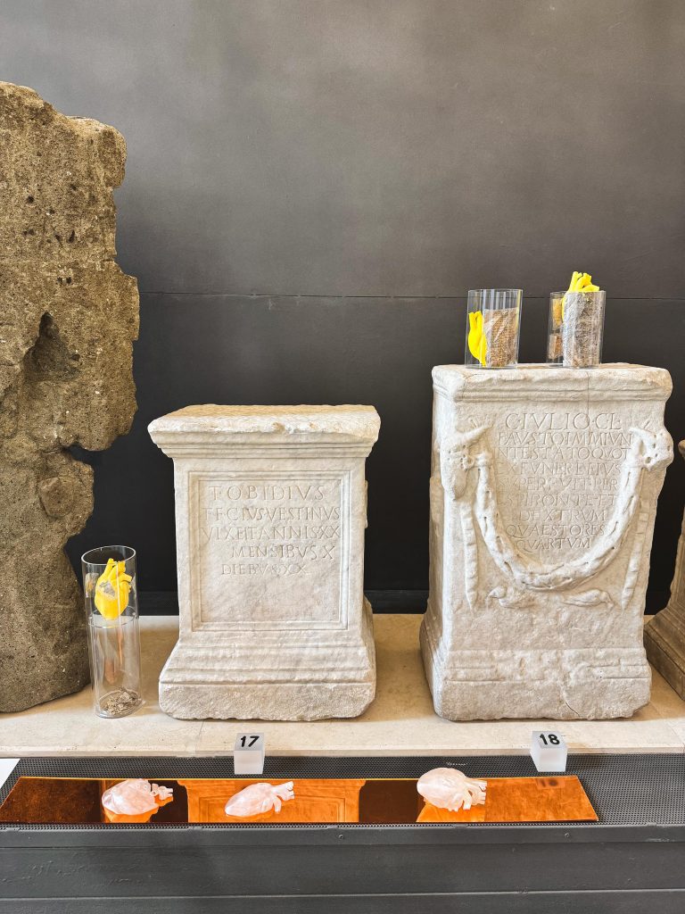 Nell’installazione site-specific “Cuori del loto / Cuori dormienti, l’invisibile che connette”, fili colorati si intrecciano in una ragnatela simbolica: verde come la natura, giallo come il sole, fonte di vita e di energia. L’opera dialoga con gli antichi reperti archeologici su cui si sviluppa, in un equilibrio profondo tra passato e presente. Sopra, cuori a grandezza naturale e fiori di loto, richiamo alla purezza e al risveglio spirituale secondo il Buddhismo del Sutra del Loto.