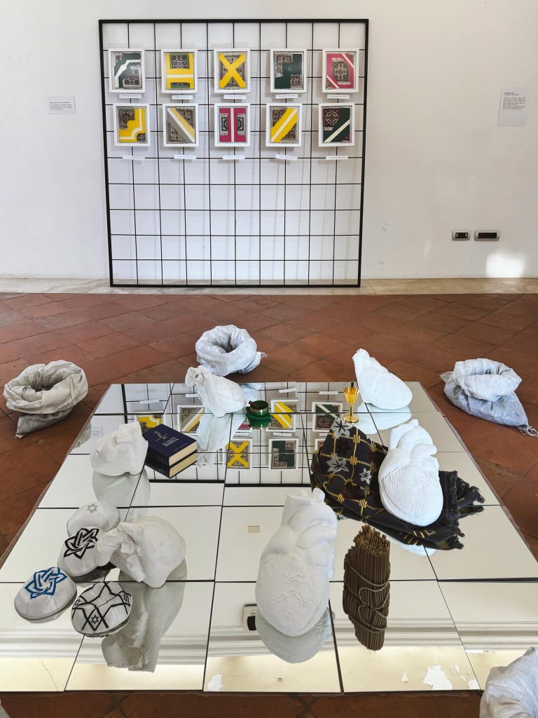 Il percorso si conclude nell’ultima sala con l’installazione “Lo spazio del sacro”: grandi cuori bianchi in gesso sono affiancati da oggetti legati alle diverse tradizioni religiose – una Bibbia, delle kippoth ebraiche, un calice cattolico, una campana tibetana, candele ortodosse, un tappeto di preghiera musulmano. A differenza delle miniature viste in precedenza, qui gli oggetti appaiono in scala reale, inseriti in un contesto che li restituisce alla loro dimensione sacra. Intorno, sacchi di carbone disposti in forma circolare richiamano la forza, l’energia e l’idea di un ciclo che si rigenera.
