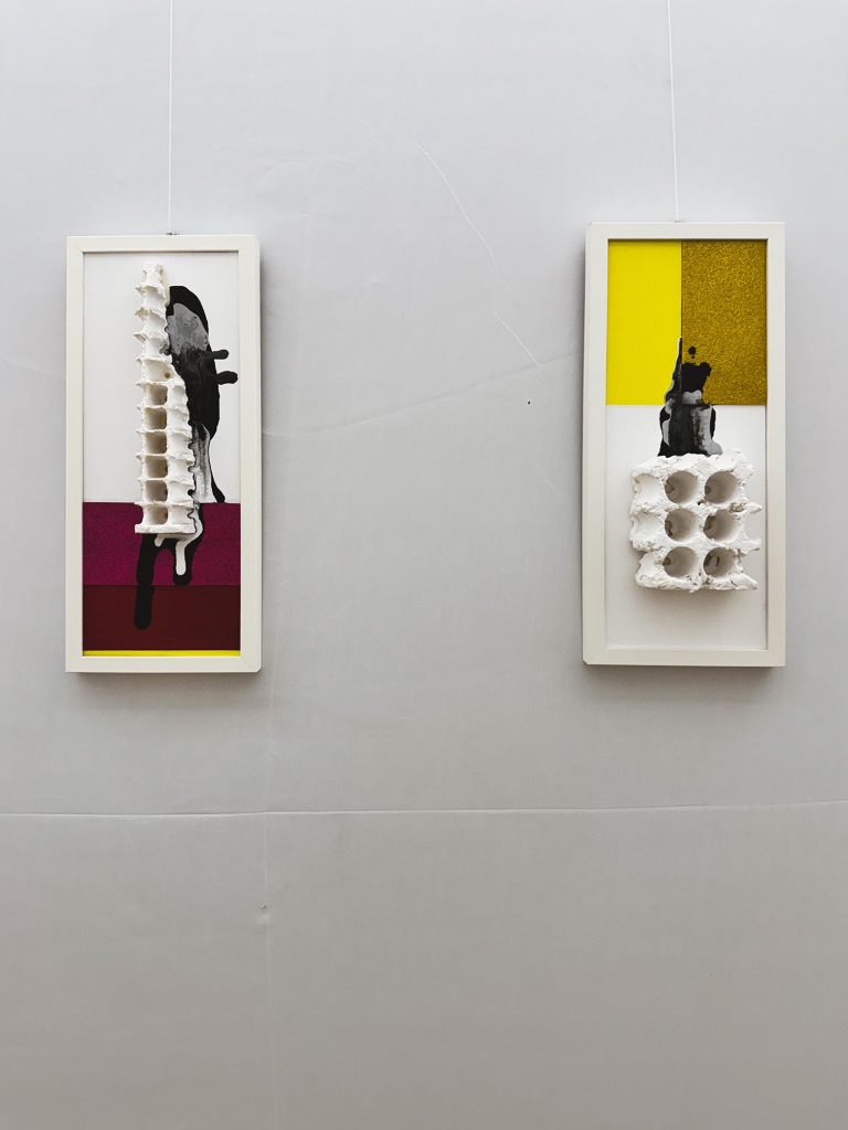 Nella serie “Glitter”, quattro opere combinano materiali e colori per evocare la presenza del sacro nel contesto urbano: sfondi luccicanti e forme industriali si fondono, suggerendo una divinità che abita anche gli scarti e i margini della città contemporanea.
