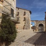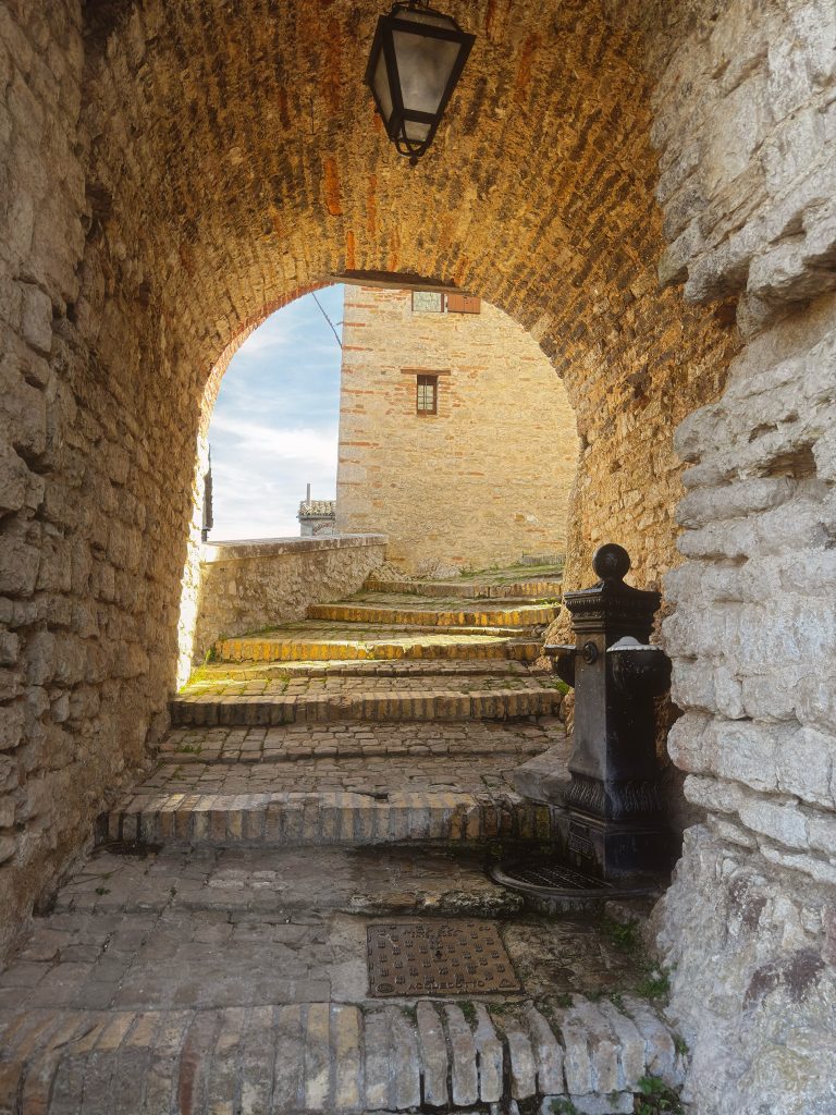 L’ingresso al borgo è ancora segnato da una sobria arcata in pietra, un tempo porta principale della cittadella fortificata. Le case, addossate le une alle altre, poggiano sulle antiche mura medievali: in molti punti la distinzione tra roccia naturale e costruzione umana si dissolve, come se il borgo fosse nato direttamente dalla montagna.