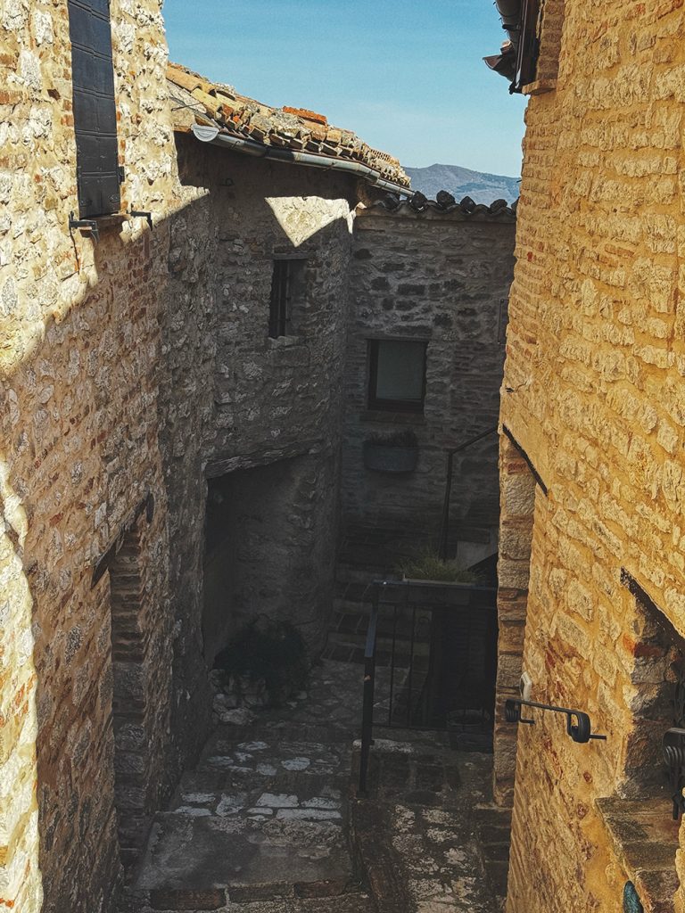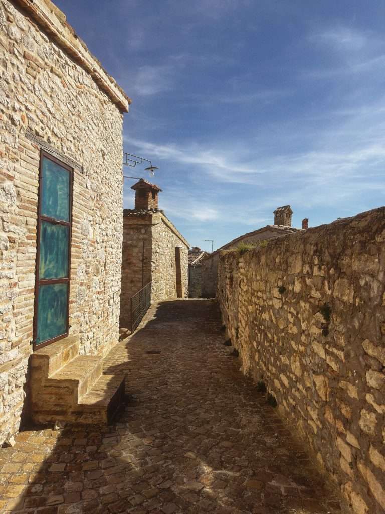 Dalla piazza si diramano vicoli stretti, percorribili solo a piedi, che si infilano tra archi, scalinate e passaggi angusti. Le abitazioni, restaurate con attenzione, mantengono un’omogeneità cromatica e materica: pietra a vista, infissi sobri, nessuna concessione all’eccesso. In alcuni punti, verso l’estremità del borgo che si affaccia sul precipizio, compaiono edifici parzialmente diroccati.